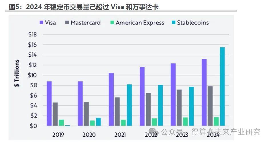 伴随加密货币的发展,全球稳定币交易量近年来不断增长。2024 年稳定币的年化交易价值达到了15.6 万亿美元,大约是Visa 和Mastercard 的119%和200%。每月交易数量达到1.1 亿笔,分别约占Visa 和Mastercard 处理的交易量的0.41%和0.72%,换言之,稳定币每笔交易的价值明显高于Visa 和Mastercard。
