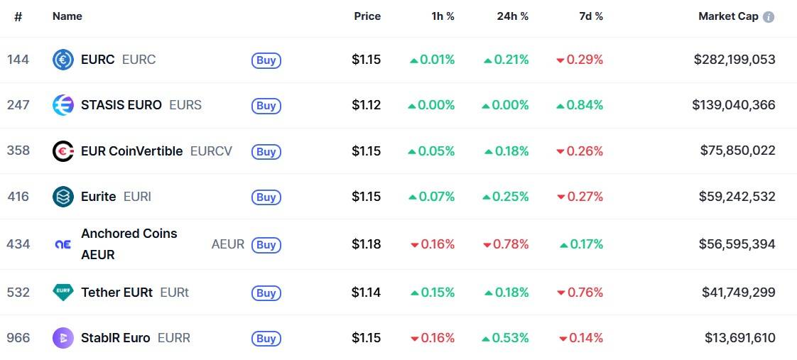 欧元稳定币的市场价值约为6.8亿美元,而美元稳定币约为3050亿美元。来源:CoinMarketCap