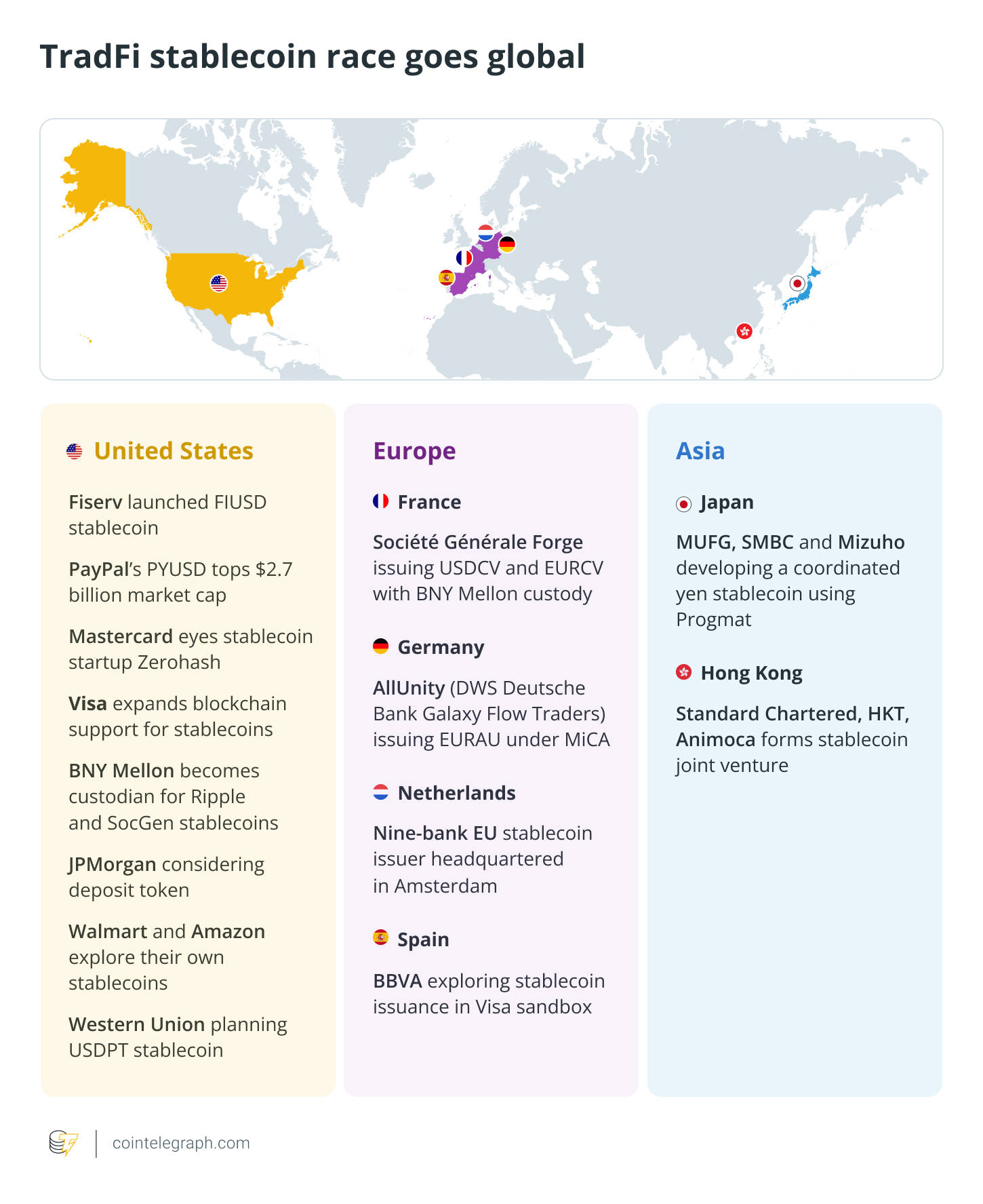 在法国,法国兴业银行的数字资产部门SG-Forge发行了EURCV和USDCV,由纽约梅隆银行托管。德国的AllUnity是DWS、德意志银行、Galaxy和Flow Traders的合资企业,已推出EURAU稳定币,并计划在多个区块链上扩展。