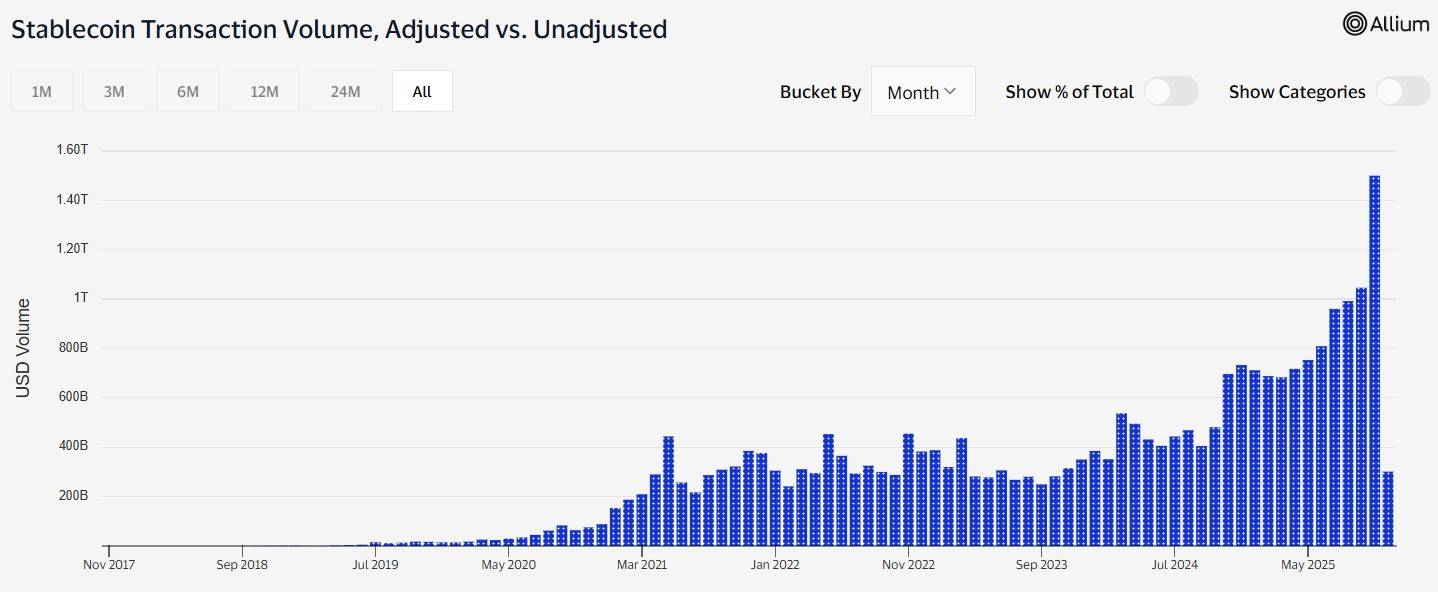 2025年10月,美国美元稳定币记录了1.5万亿美元的月度交易量。来源:Visa/Allium